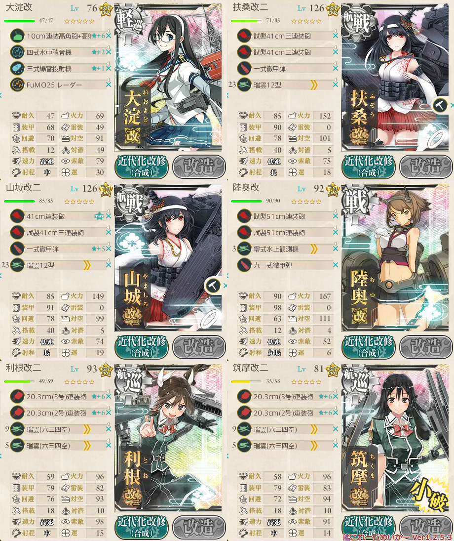 また、数値の計算には艦載機計算機(艦載機厨様)、2-5索敵値計算機(サブ様)を、SSキャプチャーに艦これ一覧めいかー(kanahiron様)を利用させていただきました。