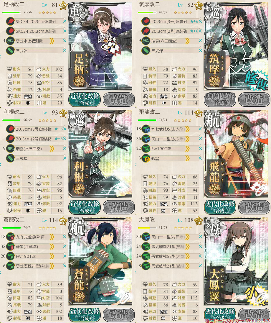 また、数値の計算には艦載機計算機(艦載機厨様)、2-5索敵値計算機(サブ様)を、SSキャプチャーに艦これ一覧めいかー(kanahiron様)を利用させていただきました。